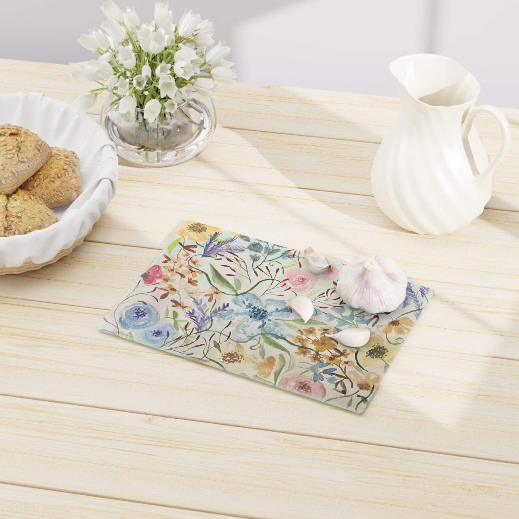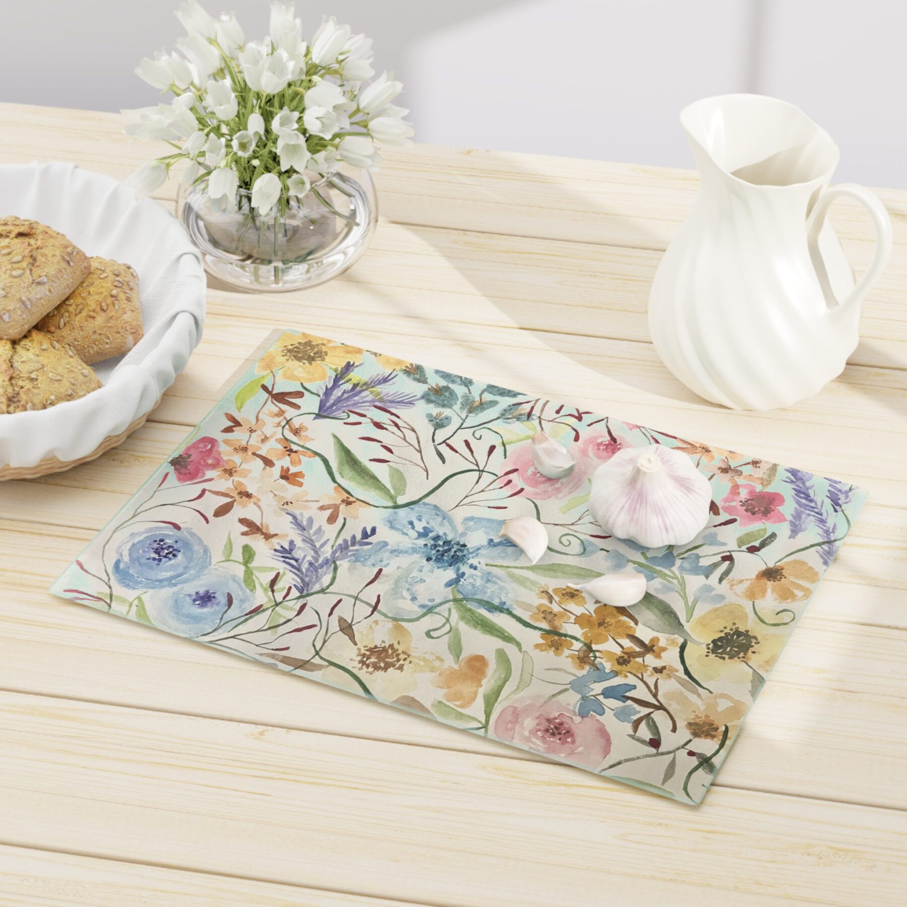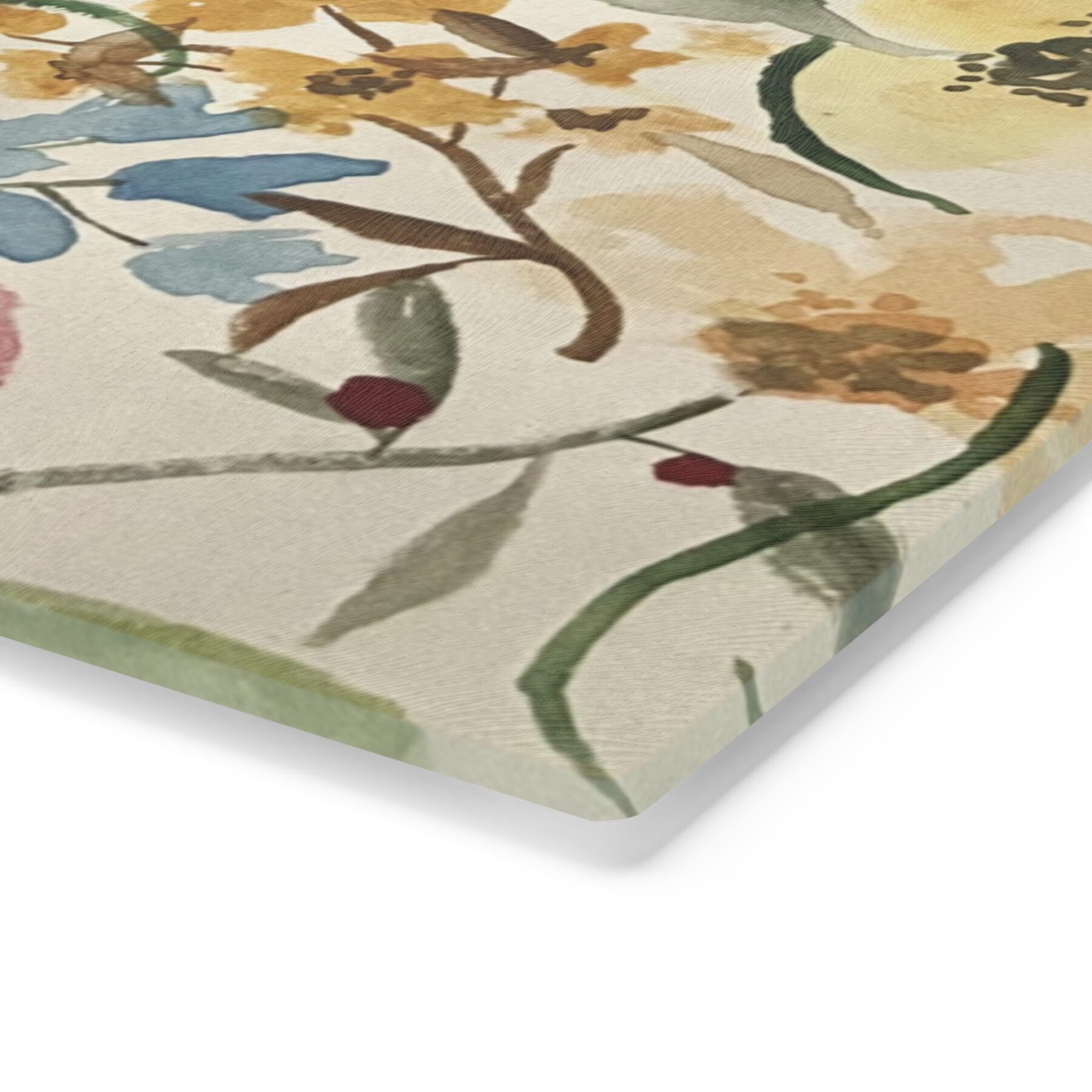 Elevate your kitchen decor with this floral painting cutting board. Suitable for dishwasher use, this tempered glass cutting board is not only stylish but also sanitary. The 4 rubber dots keep the board stable while preparing your favorite dishes.